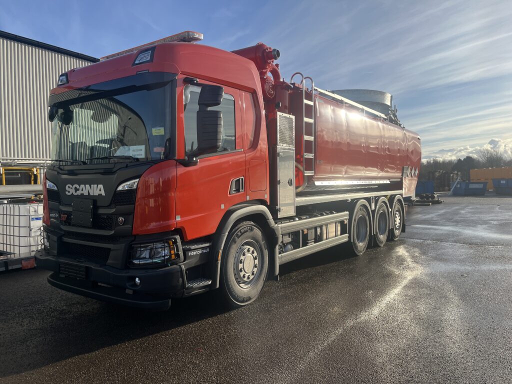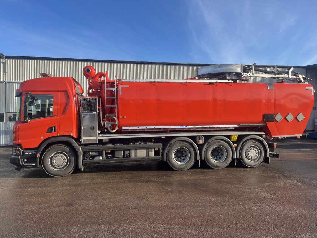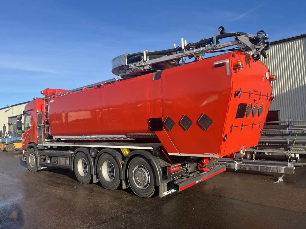 Nyproducerad Typ 3 Kombi-spolbil på totalt ca 23 m³ i rostfritt material, Ca 13² slam och 10m³ vatten. ADR-Godkänd. Öppningsbar bakgavel och tipp.