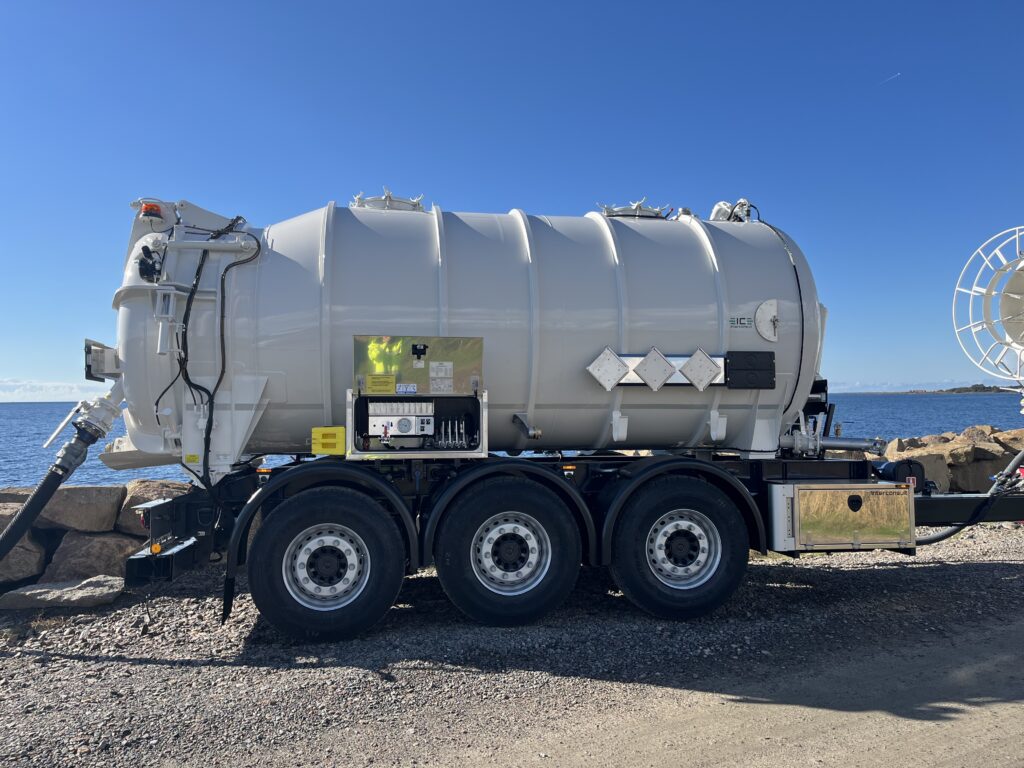 Nyproducerad 3-axlig släpkärra med tipp på 18 m3 med ett slamfack. 2st manlock, Bottenventil 4″ fram och bak i lågpunkt. ADR-Godkänd.