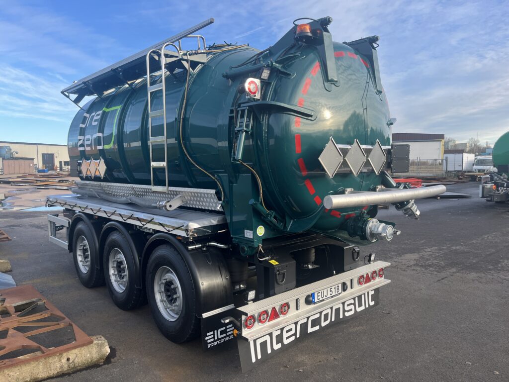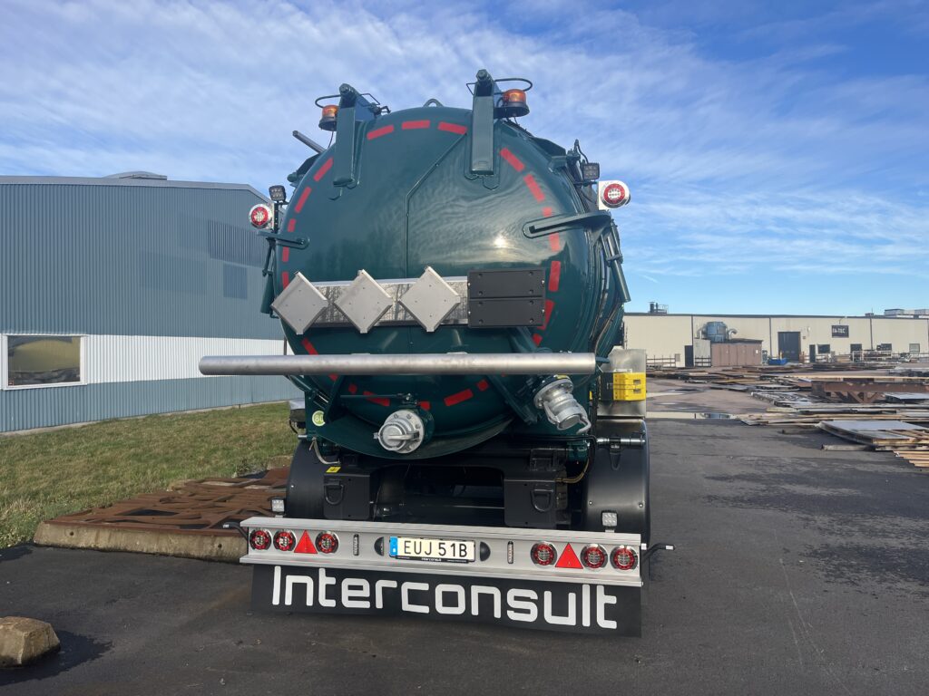 Nyproducerad 3-axlig släpkärra med tipp på 18 m3 med ett slamfack. 2st manlock, Bottenventil 4″ fram och bak i lågpunkt. ADR-Godkänd.